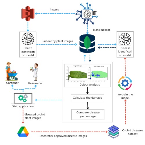 The project involves developing a sophisticated system for the identification, diagnosis, and monitoring of diseases in orchid plants, leveraging cutting-edge image processing and deep learning technologies. This system aims to automate the detection of unhealthy plants, accurately diagnose specific diseases, monitor disease progression, and continuously improve the identification model through user input. The system integrates an IoT device with a camera module for real-time image capture, a web application for data processing, and cloud storage solutions for efficient data management. By employing RCNN and CNN models for health and disease detection, respectively, and advanced image processing techniques for monitoring, the system provides actionable insights and recommendations for disease management. This project seeks to enhance plant health monitoring, streamline disease identification processes, and expand the capability of disease detection models, ultimately contributing to the sustainability and productivity of orchid cultivation.